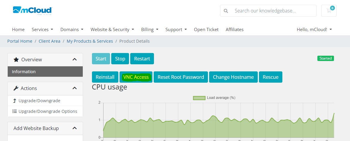 Para acessar o cliente web VNC, primeiro faça login em sua conta e na área do cliente clique em: SERVIÇOS > SELECIONE O PRODUTO > VNC ACCESS.
